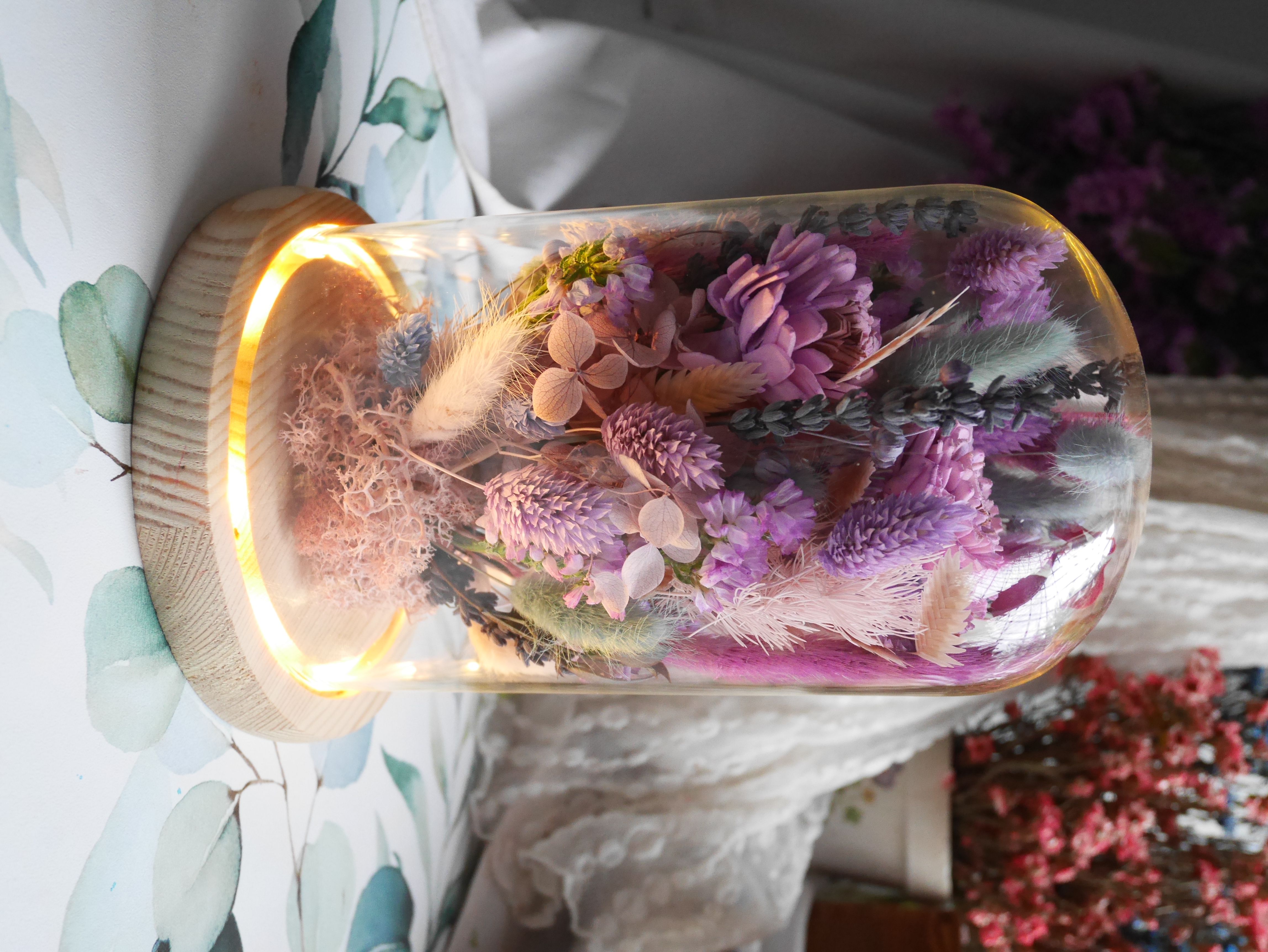 Subtelne oświetlenie LED delikatnie rozświetla całość, podkreślając detale kompozycji i tworząc nastrojową, przyjemną poświatę.