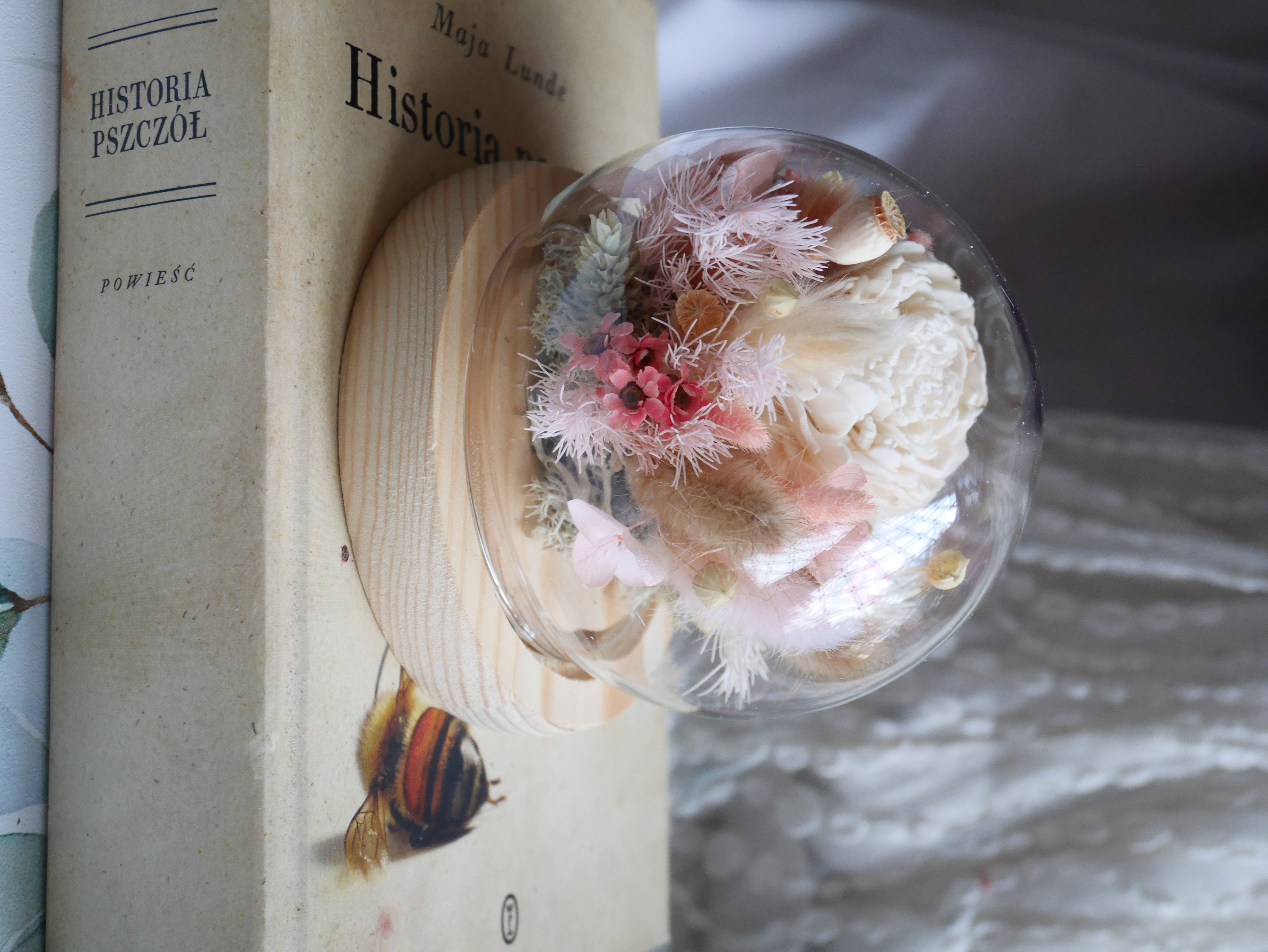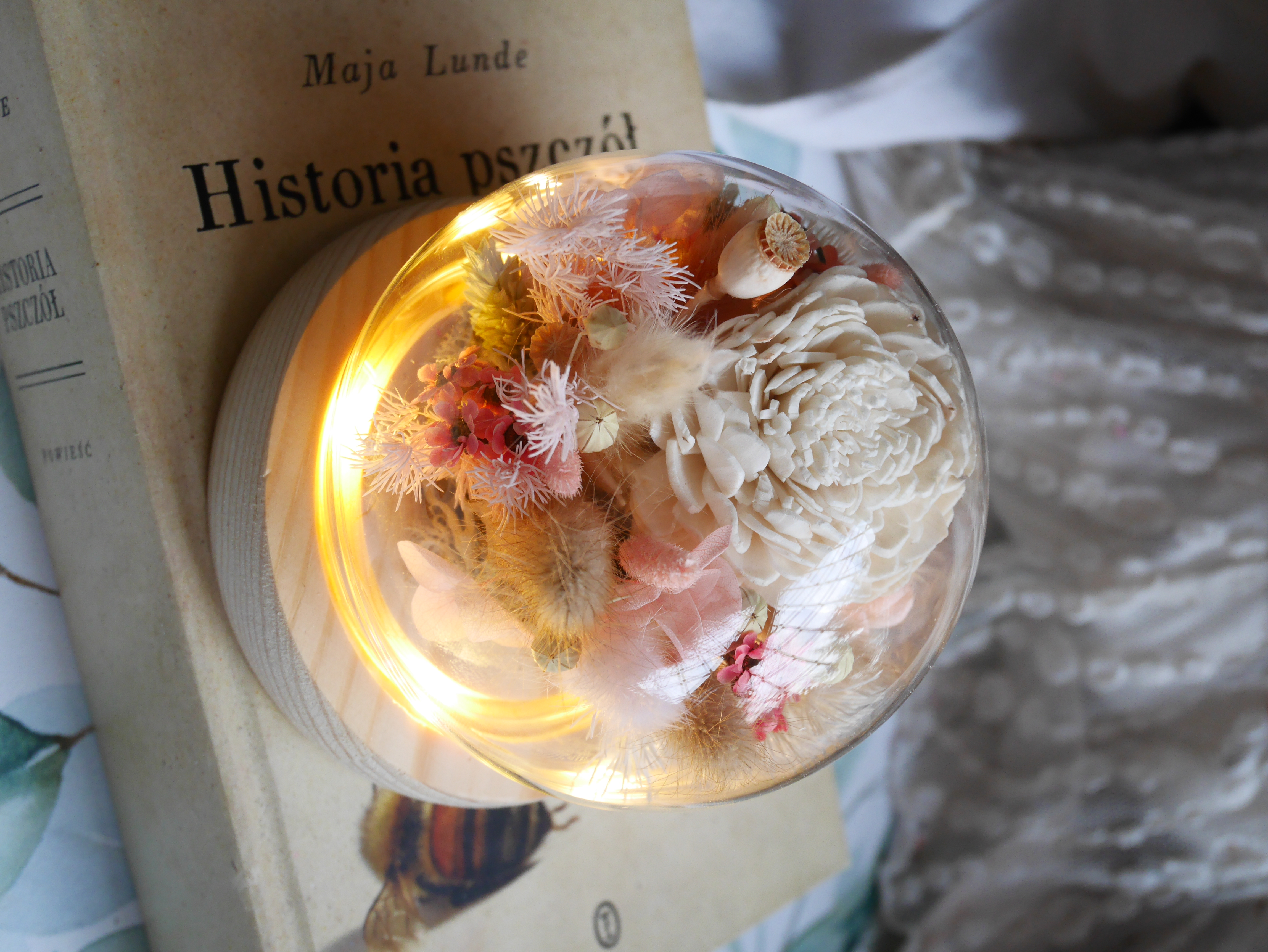 Elegancka kula dekoracyjna z suszonymi kwiatami to subtelny dodatek, który wprowadza do wnętrza ciepły i romantyczny klimat. Kompozycja naturalnych, suszonych kwiatów w beżowych odcieniach została zamknięta w przezroczystej szklanej kuli osadzonej na drewnianej podstawie. Delikatne podświetlenie LED pięknie podkreśla detale roślin, tworząc przytulną atmosferę zarówno w dzień, jak i po zmroku.