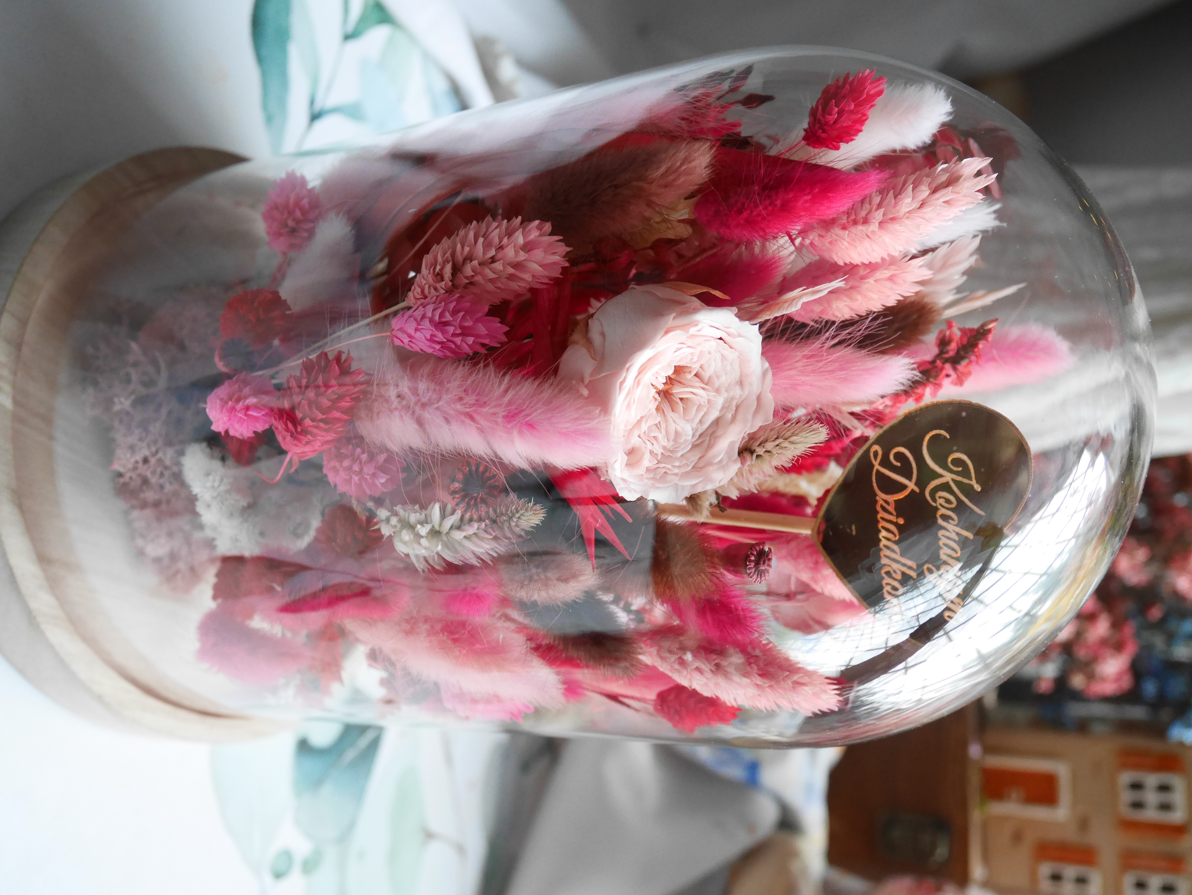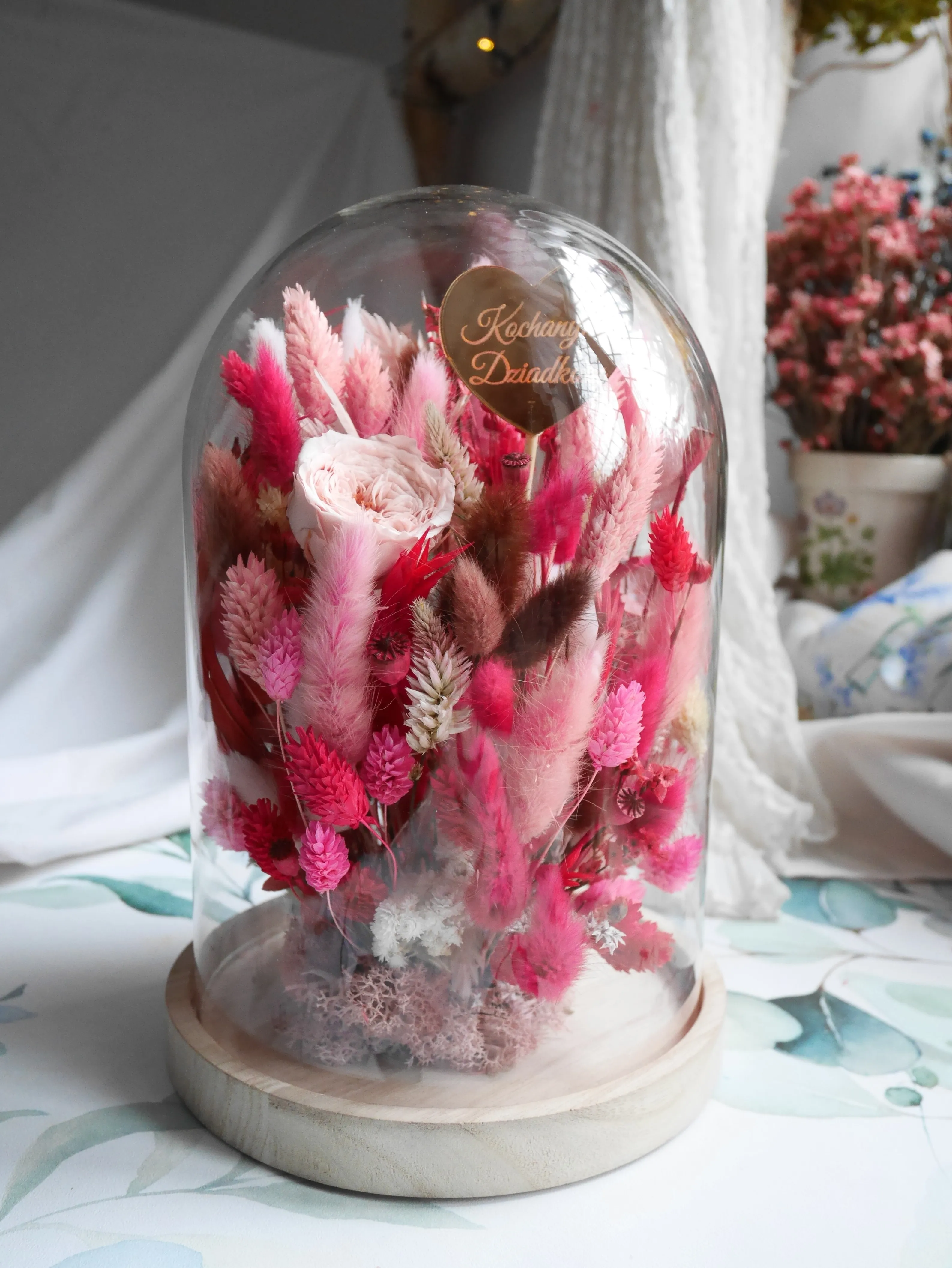 Wnętrze kopuły wypełnia starannie dobrana kompozycja w intensywnych odcieniach różu, malin i delikatnej bieli. Centralnym elementem jest stabilizowana róża, otoczona dekoracyjnymi trawami i kwiatami suszonymi, które nadają całości głębi i elegancji. Ozdobne serce z napisem „Kochanym Dziadkom” podkreśla osobisty charakter upominku. Całość osadzona jest na solidnej, drewnianej podstawie.