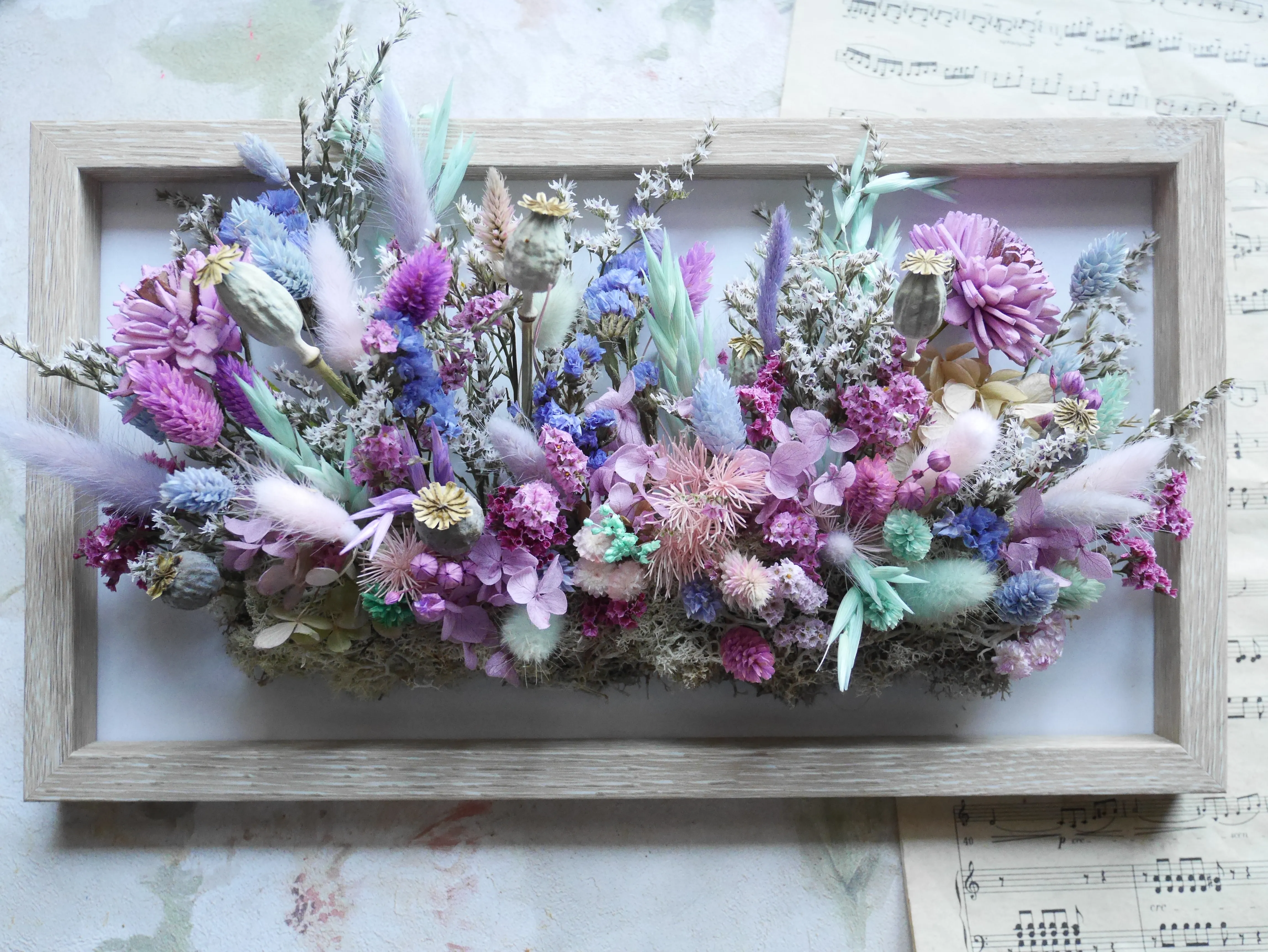 Wprowadź do swojego wnętrza odrobinę naturalnego piękna dzięki wyjątkowej ramce z kompozycją suszonych kwiatów. Ta starannie wykonana dekoracja to harmonijne połączenie pastelowych odcieni różu, fioletu i bieli, zestawionych z naturalną zielenią i delikatnymi akcentami ecru. Każdy element został ułożony ręcznie, tworząc subtelną, lecz efektowną kompozycję, która przyciąga wzrok i nadaje przestrzeni elegancji oraz lekkości.