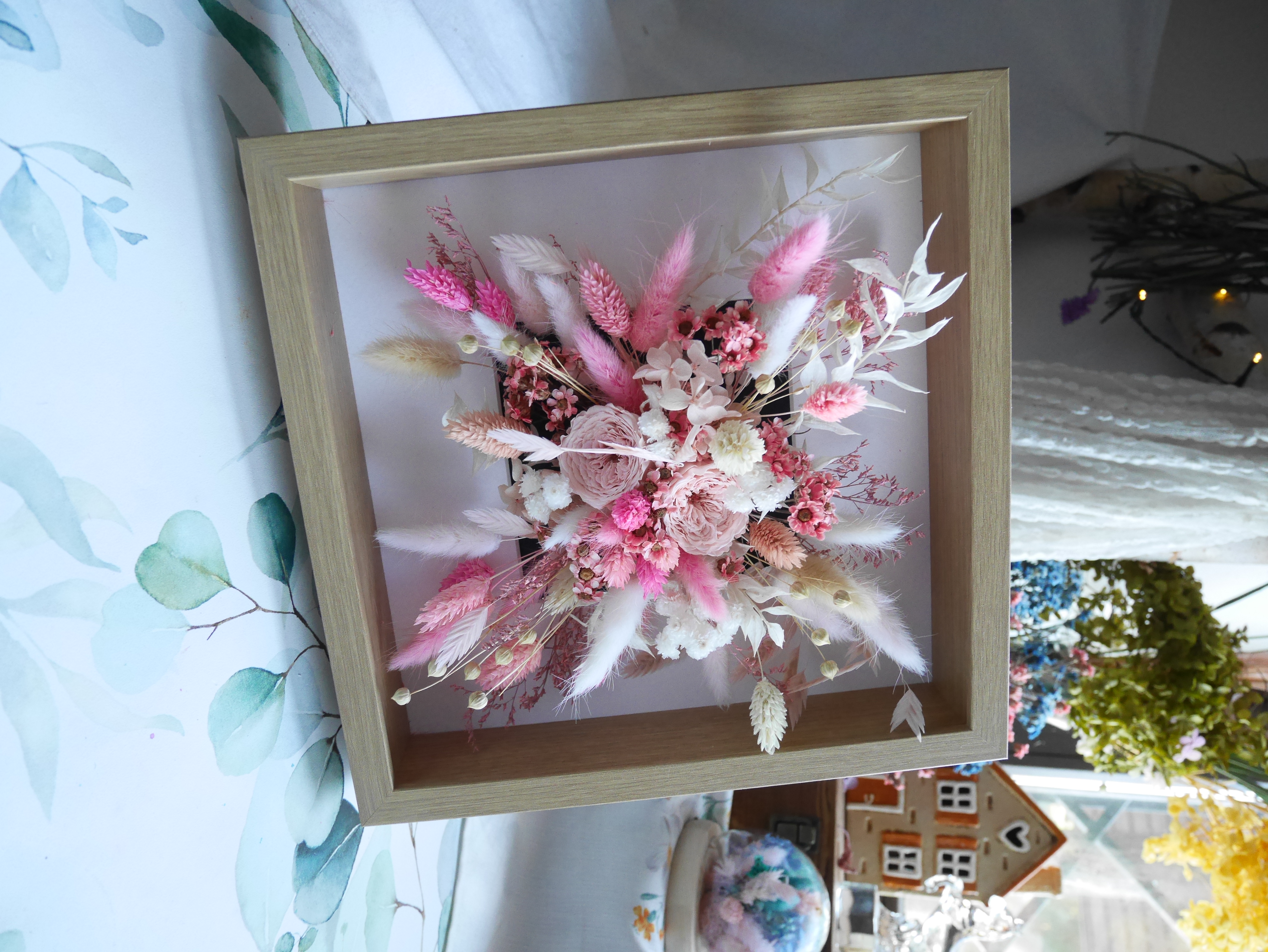 Kompozycja utrzymana jest w różowej tonacji kolorystycznej, z centralnie umieszczoną stabilizowaną różą, stanowiącą główny punkt dekoracji. Otaczające ją suszone i stabilizowane elementy roślinne tworzą harmonijną, przestrzenną aranżację, dając efekt 3D, który przyciąga wzrok i nadaje obrazowi głębi.