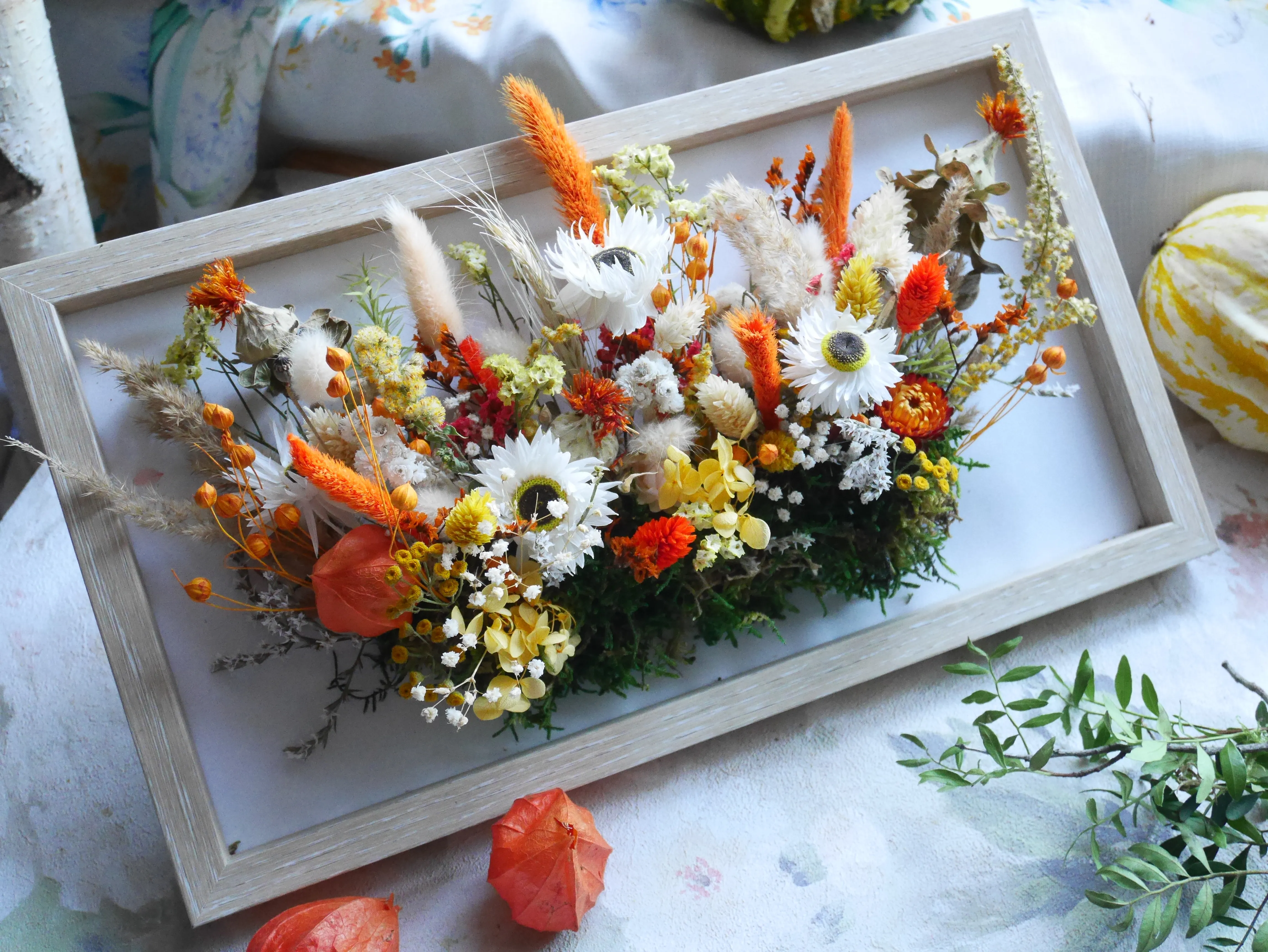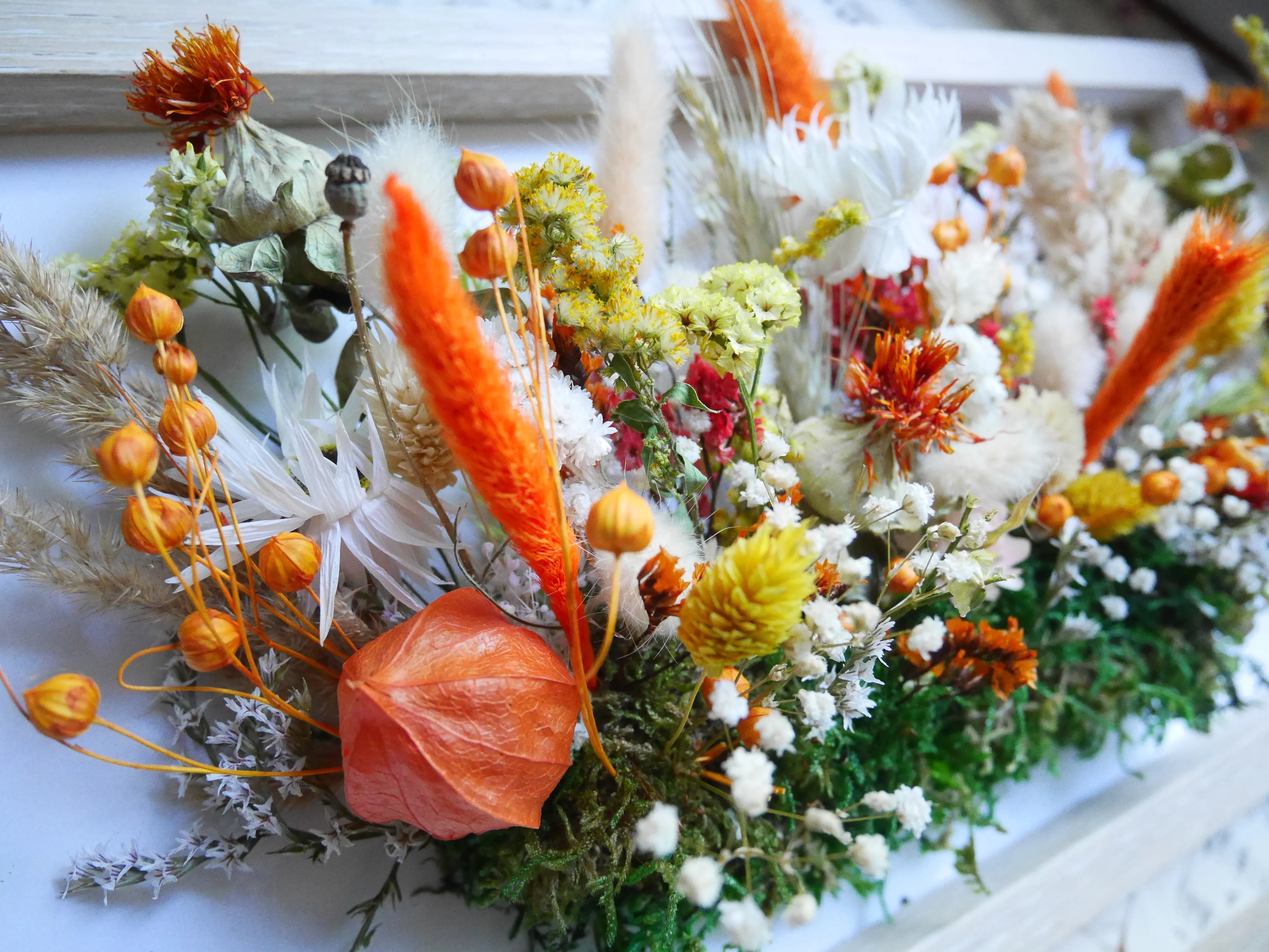 Wnieś do swojego wnętrza energię i naturalny wdzięk dzięki tej wyjątkowej ramce z kompozycją suszonych kwiatów w odcieniach pomarańczy, żółci i bieli. To pełna życia dekoracja, która łączy w sobie barwy jesieni z lekkością letnich łąk. Ręczne ułożenie każdego elementu sprawia, że kompozycja jest unikatowa i zachwyca bogactwem struktur oraz kolorów.