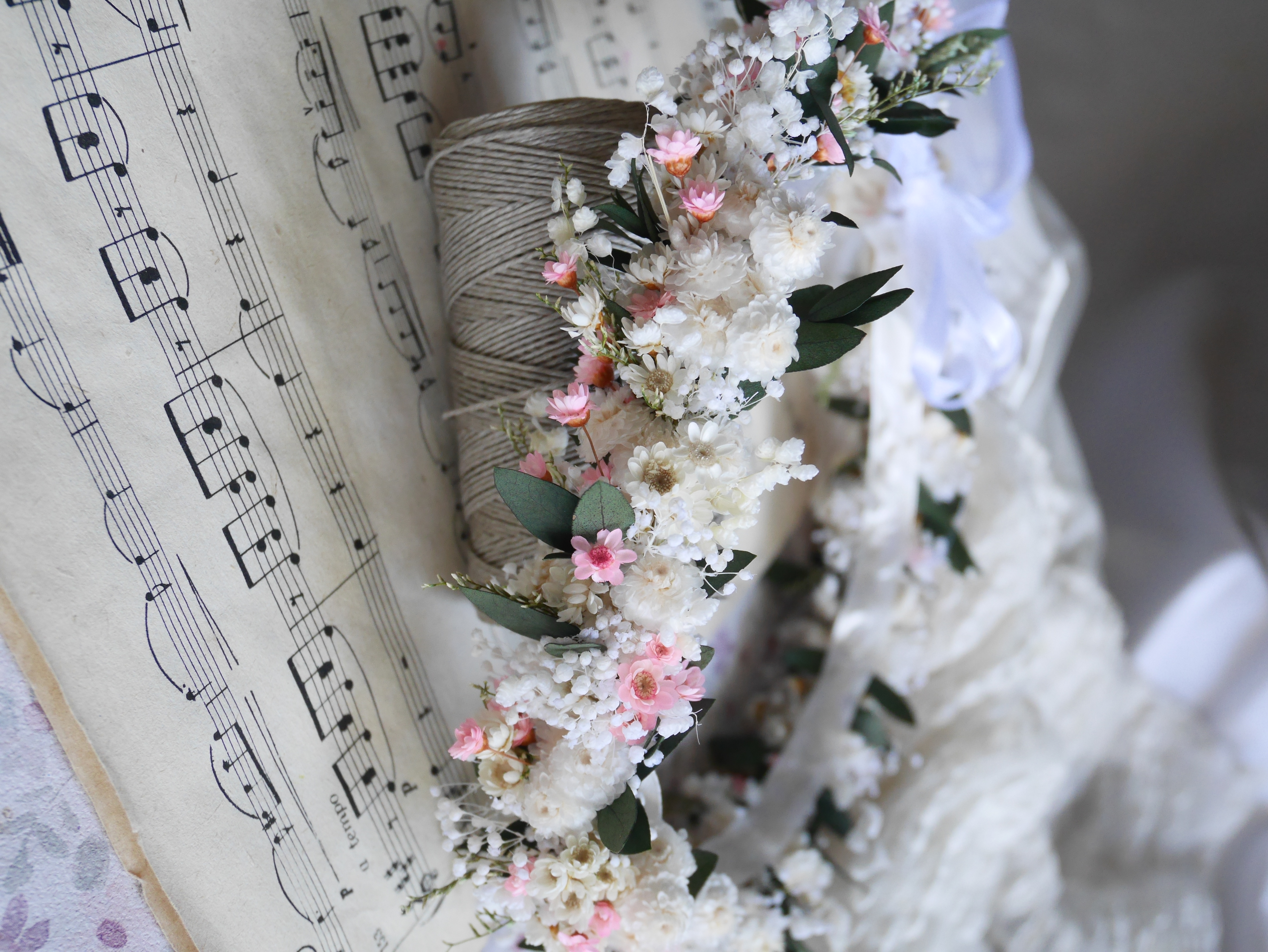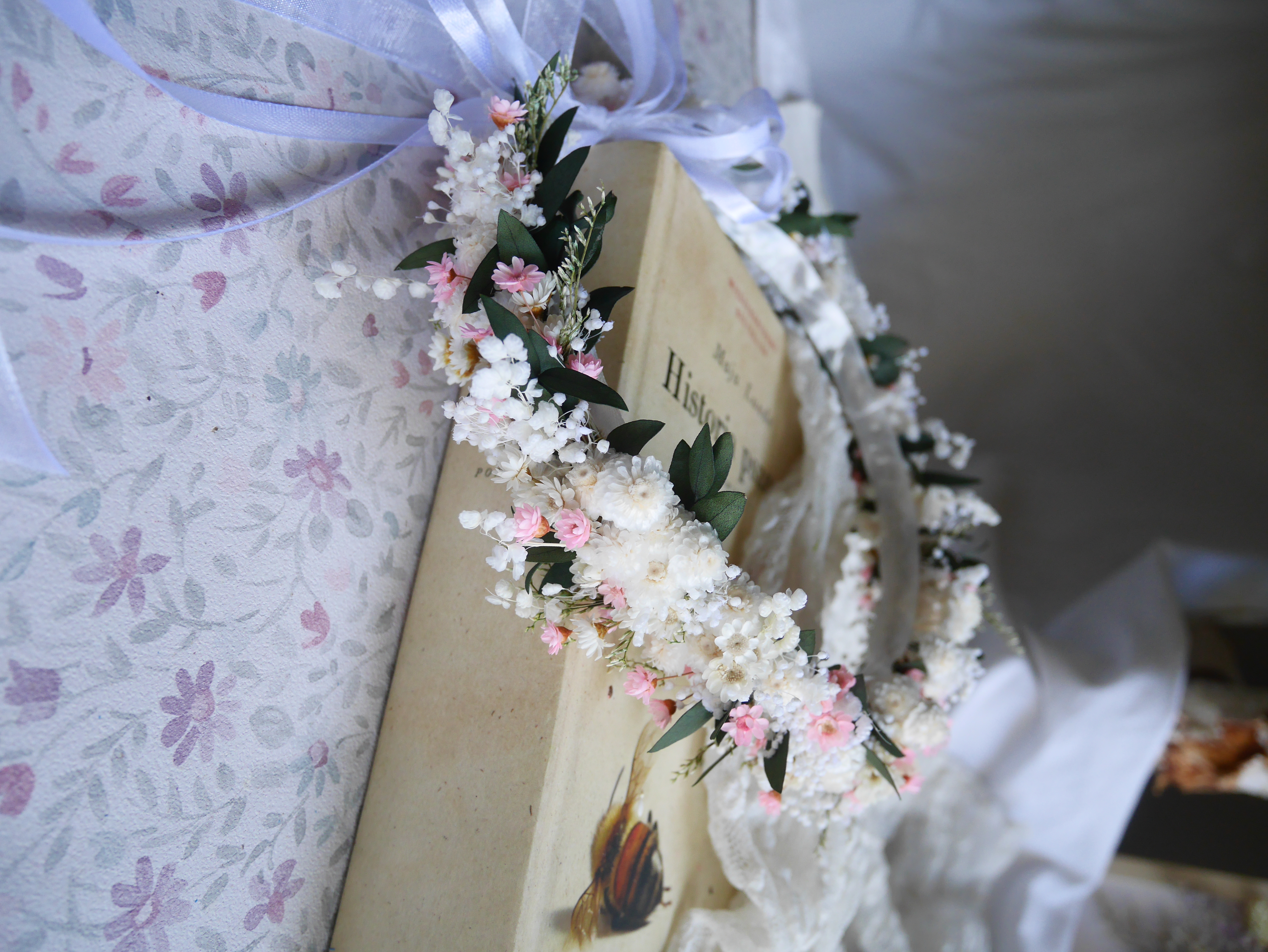 Delikatny wianek komunijny wykonany z suszonych i stabilizowanych roślin, tworzony indywidualnie na zamówienie. Każda kompozycja powstaje ręcznie z najwyższą starannością, z dbałością o detale i harmonijne zestawienie kolorów. Naturalne materiały nadają wiankowi lekkości i ponadczasowej elegancji, a dzięki suszeniu i stabilizacji zachowuje on swój piękny wygląd na długo. To wyjątkowa, niepowtarzalna ozdoba.