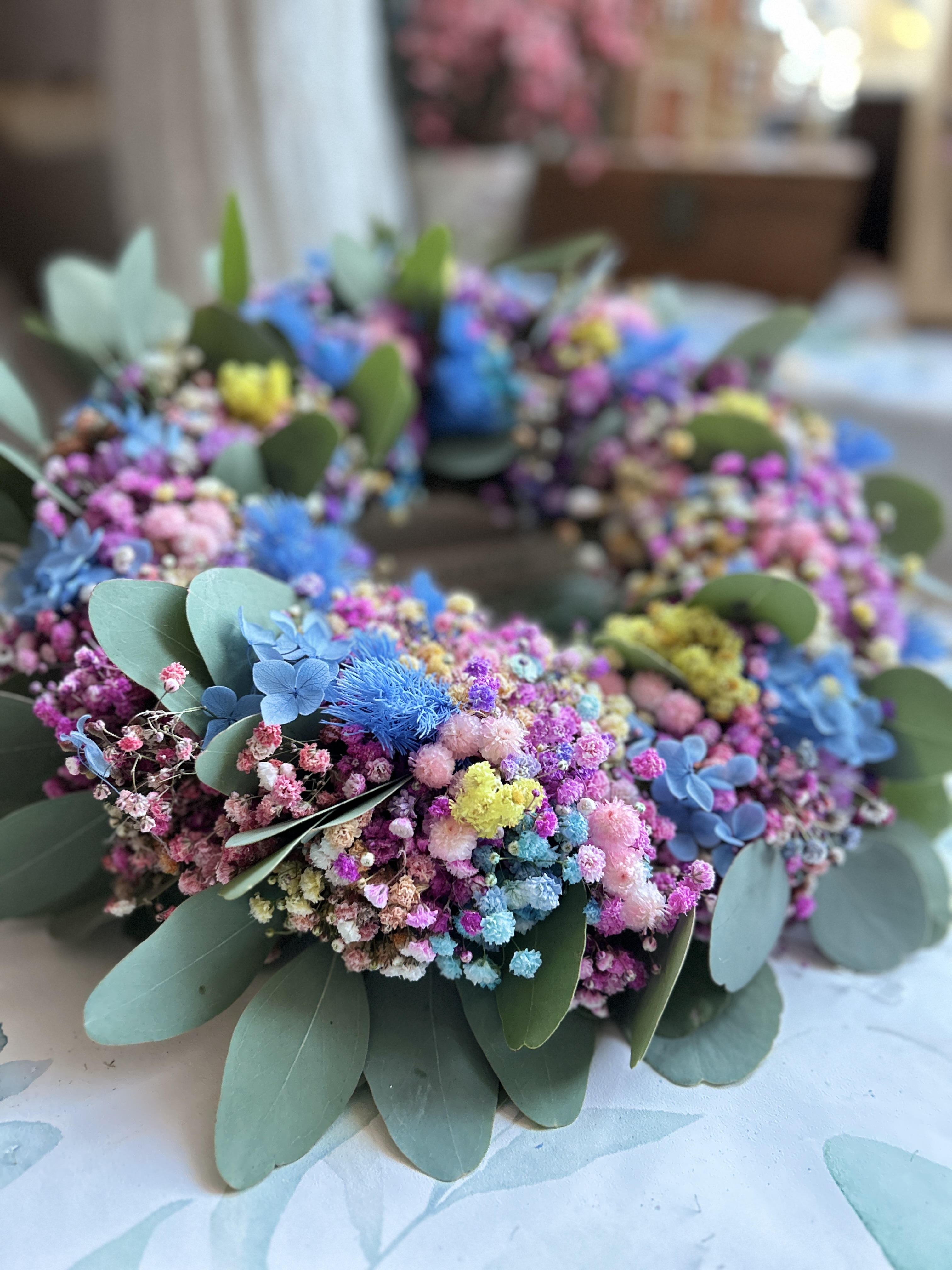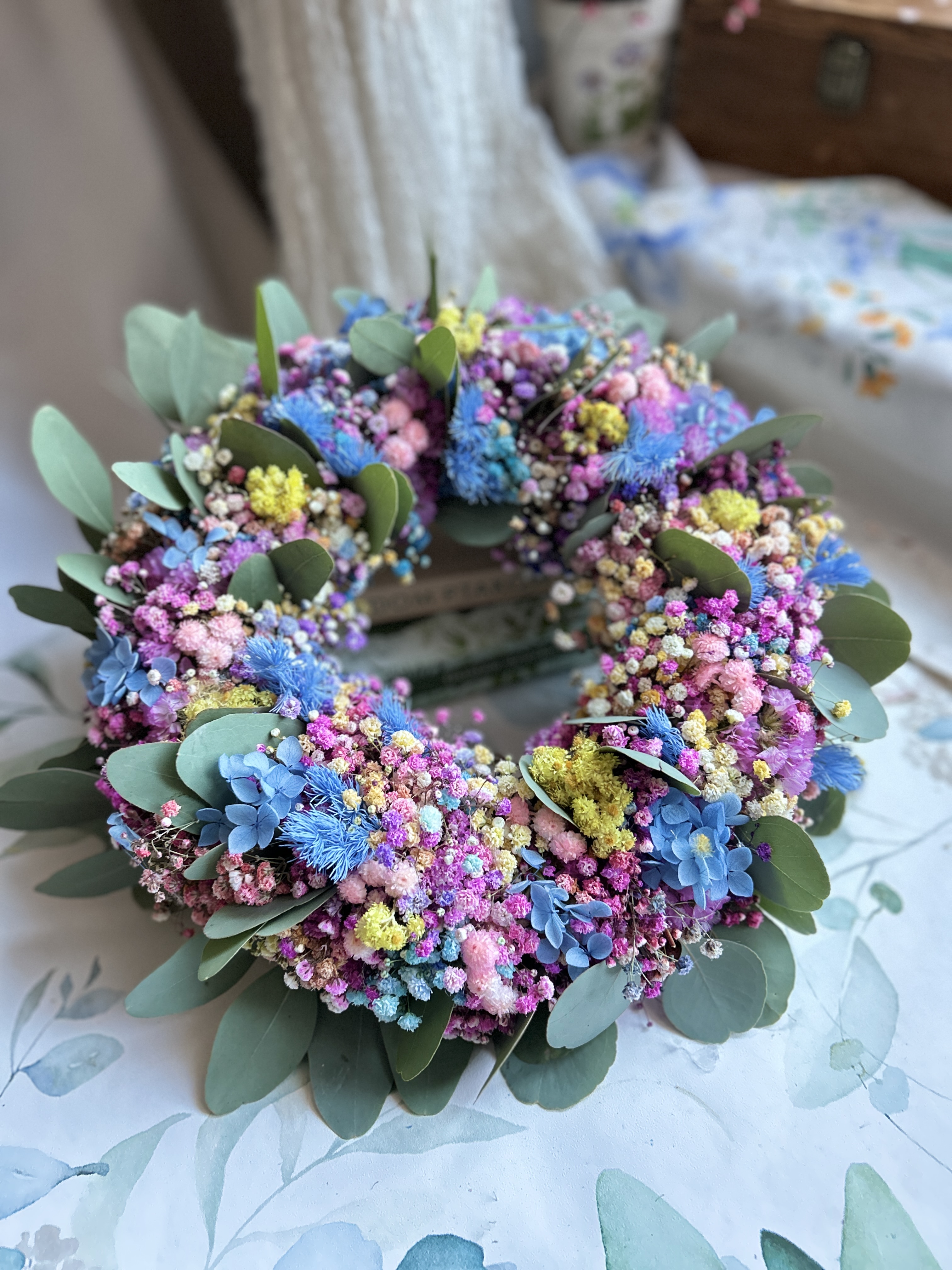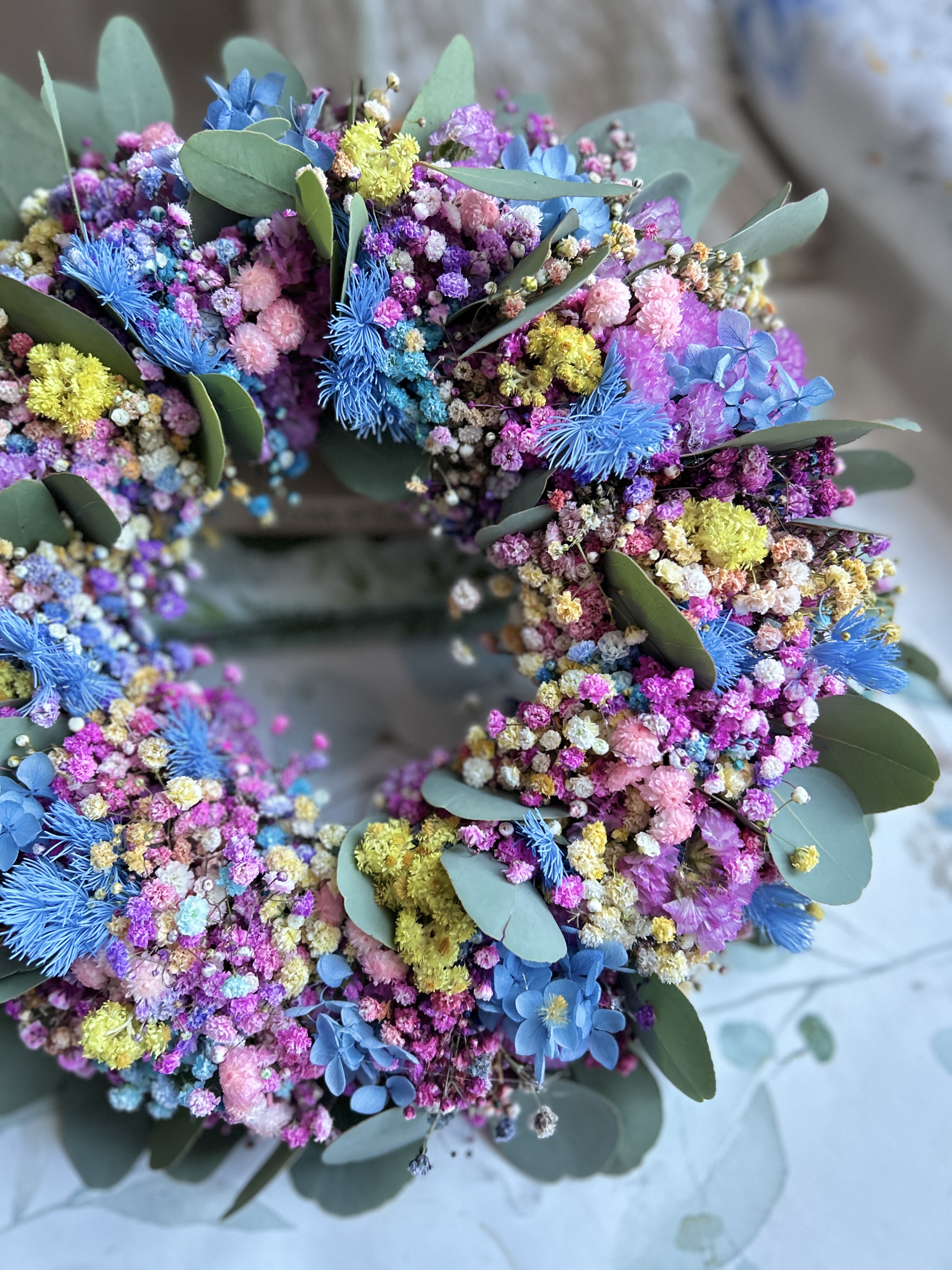 Delikatny, bajkowy wianek wykonany ze świeżej gipsówki w pastelowej palecie barw: pudrowego różu, lawendy, błękitu i słonecznej żółci, uzupełniony miękką zielenią eukaliptusa. Kompozycja przypomina letnią łąkę zamkniętą w okręgu – pełną lekkości, światła i subtelnego uroku.