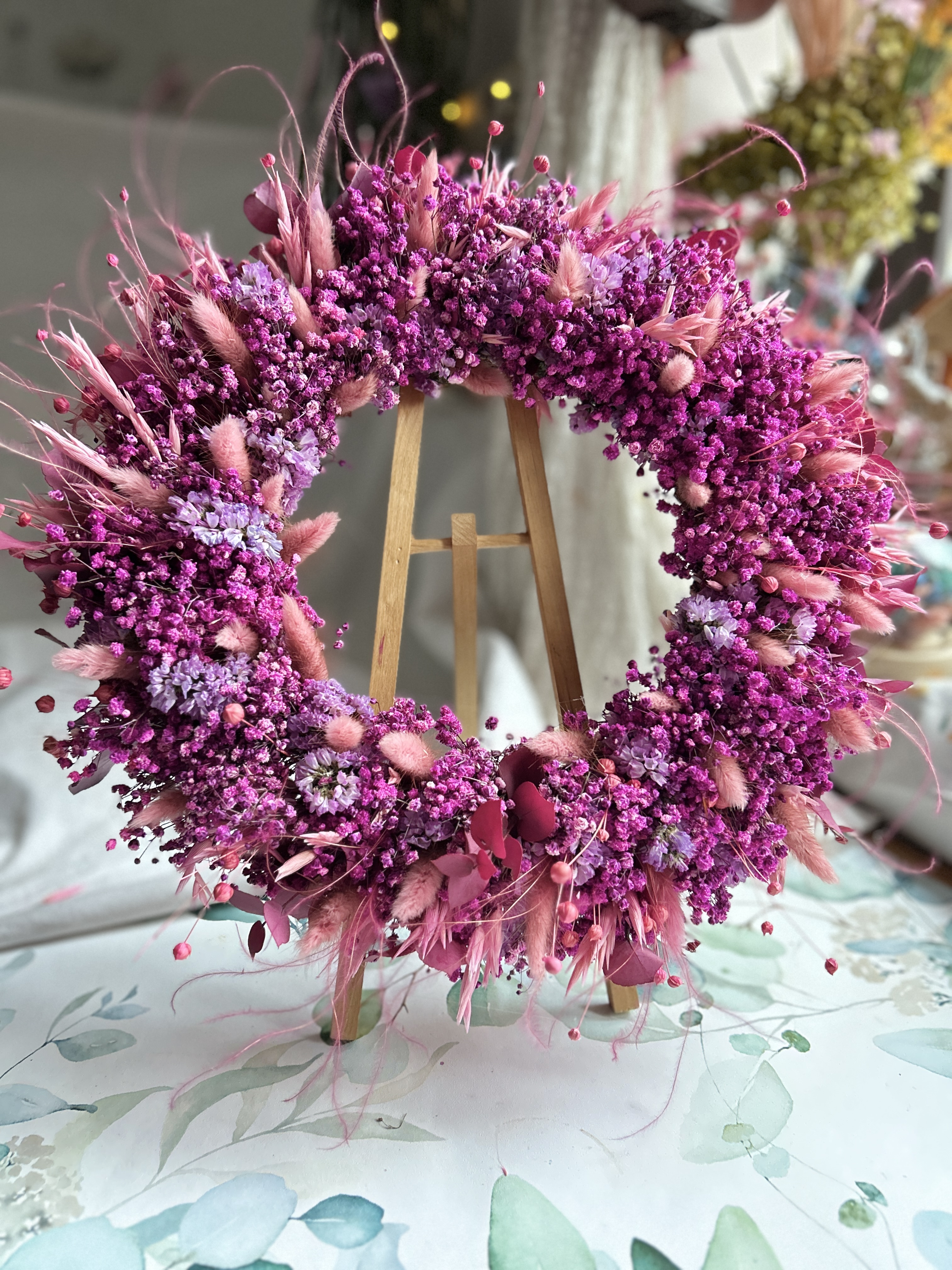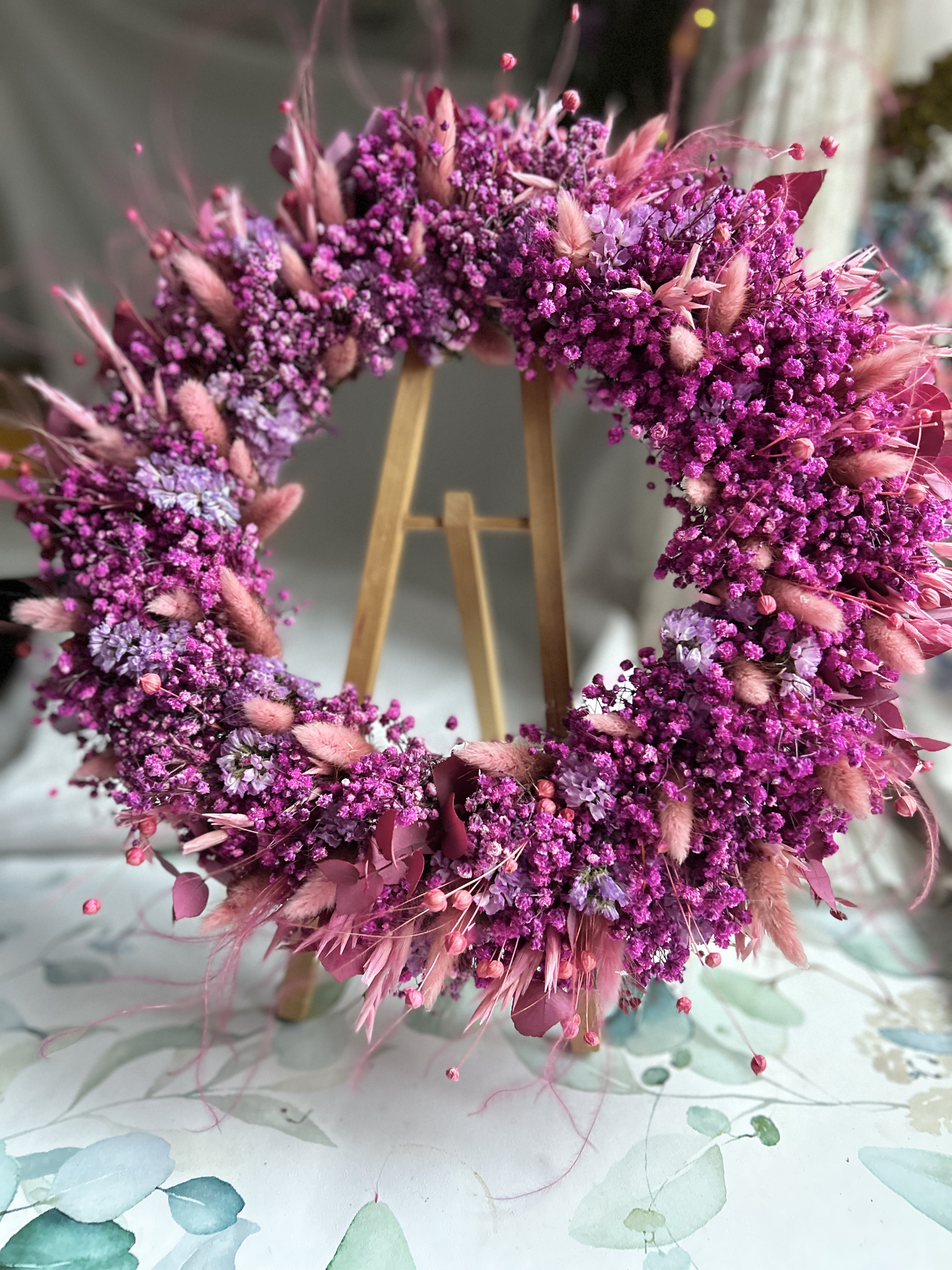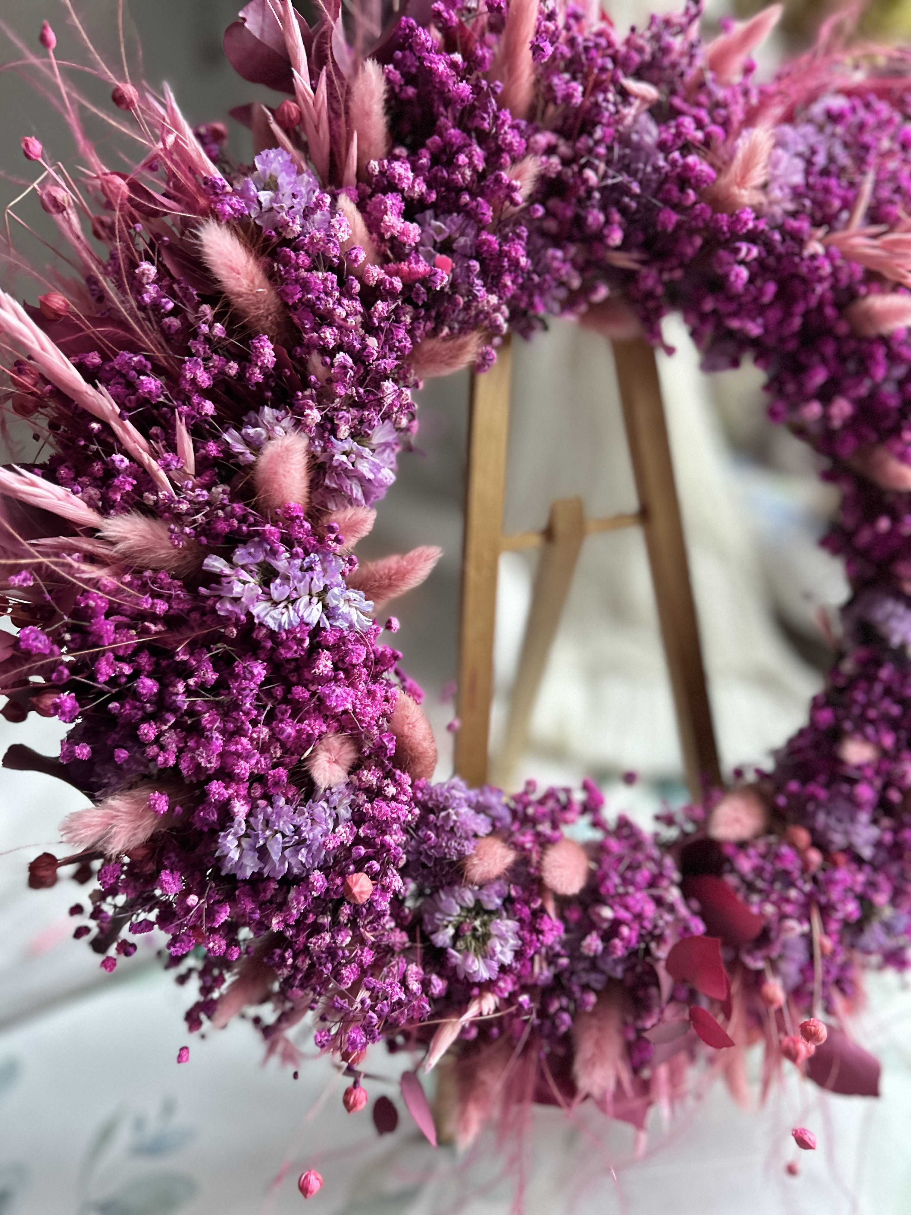 Wyjątkowy wianek na naturalnej drewnianej obręczy, stworzony z wysokiej jakości suszonych kwiatów i traw. Kompozycja zachwyca intensywnymi odcieniami fioletu, purpury i różu, przełamanymi delikatnymi, pudrowymi akcentami, które nadają całości lekkości i elegancji.